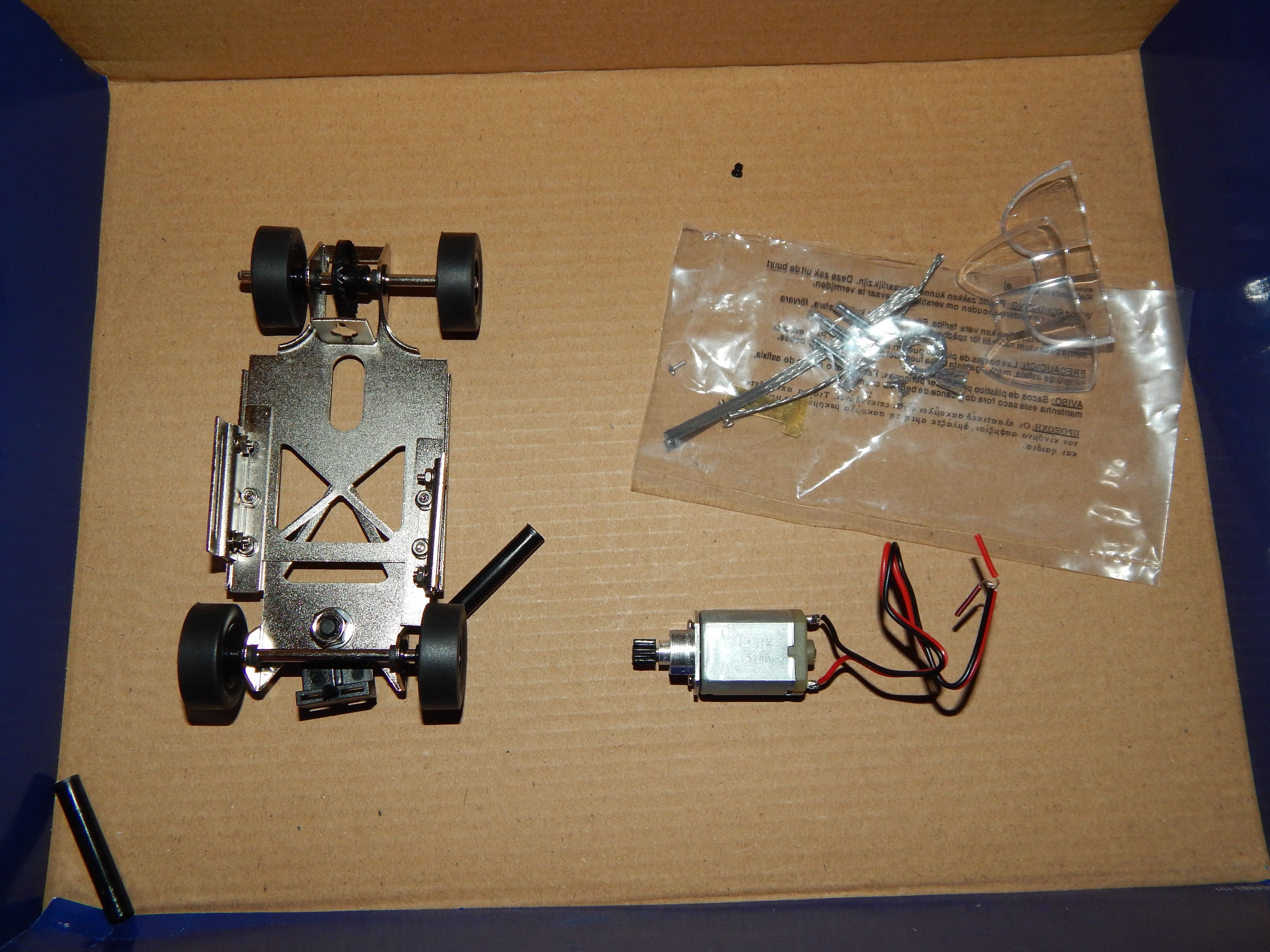 the chasis is roughly made up. Everything on hold at the moment.  I have hit a bit of a problem working out how to get the axle spacers and wheels affixed to the slot car chassis – any ideas or tips appreciated.