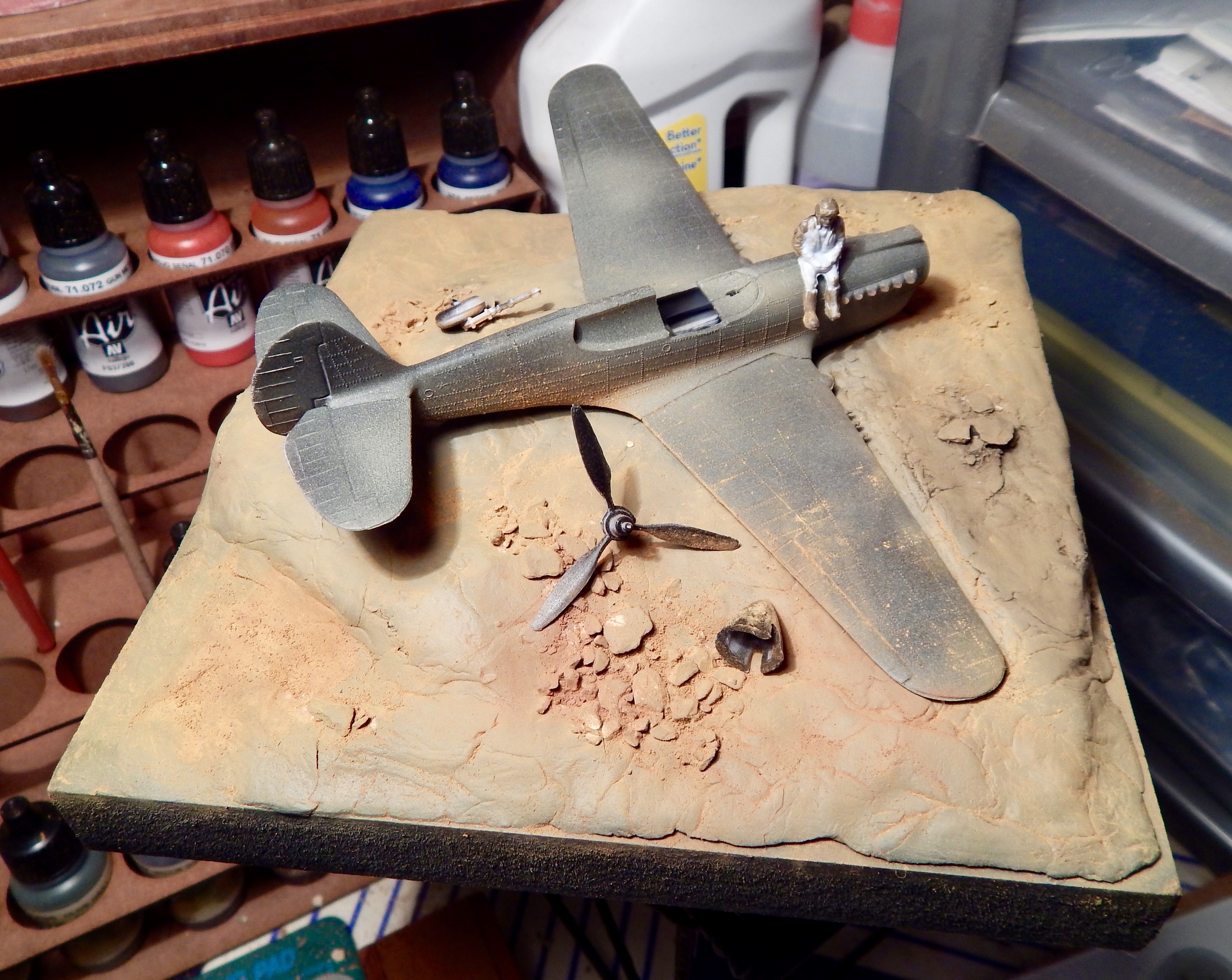 Worked some pigments into the scene to try and create more of a desert landscape feel. Still a lot of weathering and painting needed for the aircraft but starting to take shape..