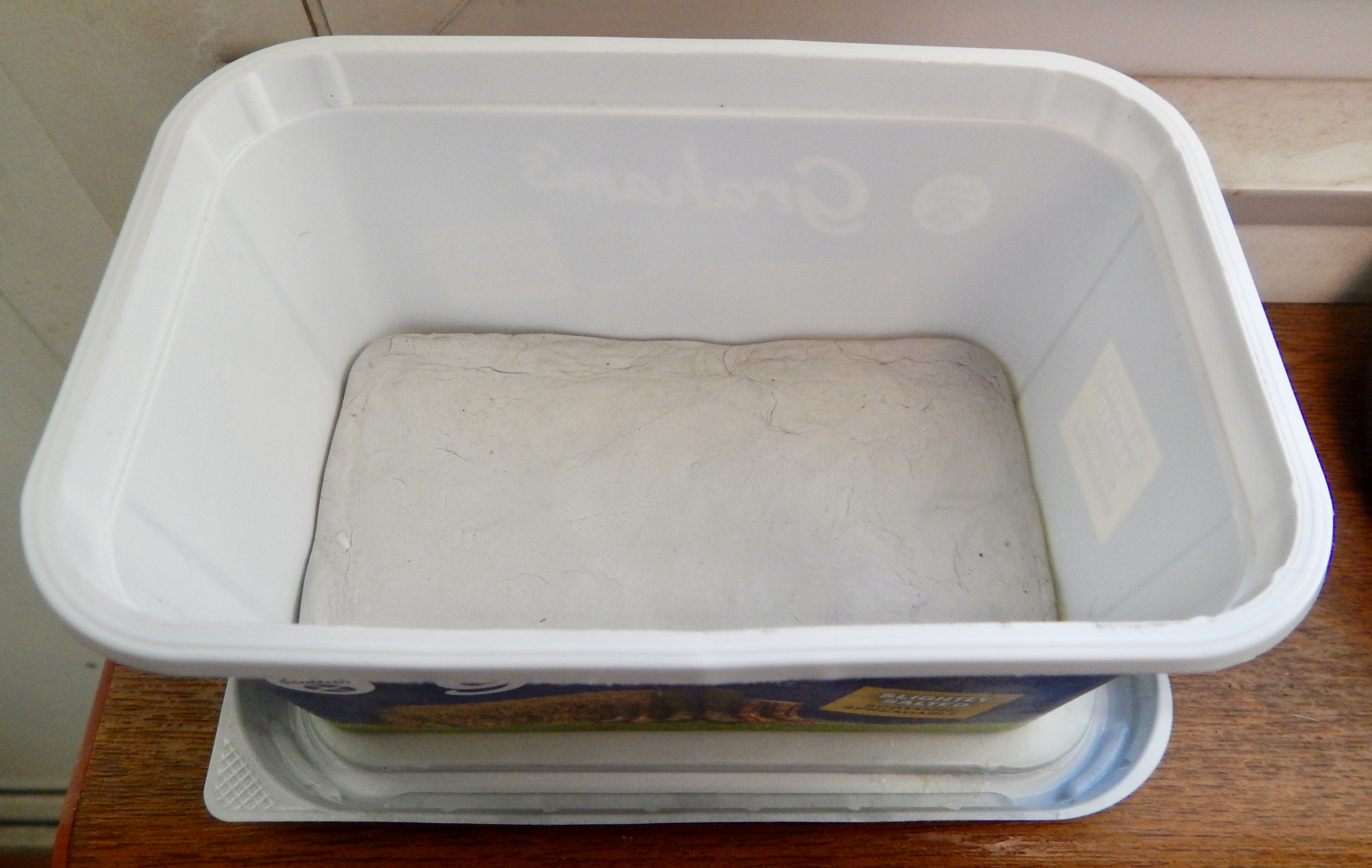 Pressed some air dry clay into the bottom of a margarine tub – this will become the base for the diorama…
